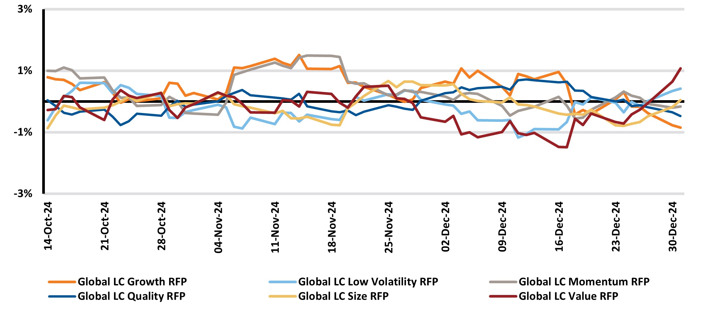 The performance dispersion among Global Russell Factor Portfolios (RFPs) in the fourth quarter was smaller than prior quarters, with dispersions between Value and Growth factors bound to +/-2% for most of the quarter. Growth and Momentum outperformed the market for the majority of the entire quarter, while Value and Low Volatility underperformed before recovering slightly to finish the quarter off their lows.