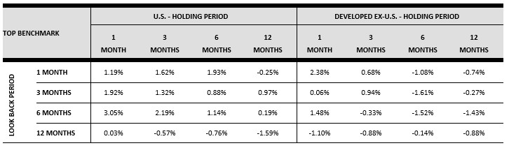 Shorter look-back periods of 1, 3, and 6 months—when combined with short holding periods of 1-3 months—show a premium across both U.S. and Developed ex-U.S. regions. The higher premium of 3.1% was in the U.S. region for a 1-month holding period, using a 6-month look-back. The longest look-back period did not have any meaningful excess returns, with the highest return at 12 basis points.